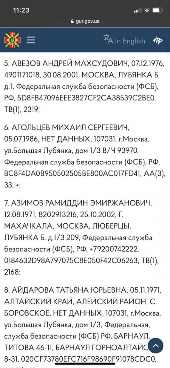Розвідка України здобула список працівників ФСБ Росії, які беруть участь у злочинній діяльності країни-агресора на території Європи.