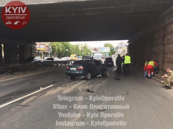 "На проспекті Перемоги зіштовхнулися три авто: Daewoo, Volkswagen і Renault. На місце прибули патрульні поліцейські. Згодом слідчо-оперативна група. За попередніми даними, водій Lanos влетів у Renault. Після зіткнення його відкинуло до третьої машині – Volkswagen. За словами одного із потерпілих водіїв, він не бачив Lanos і не чув його гальмівного шляху. В результаті ДТП постраждали водій та пасажир Lanos. Обох із травмами грудних кліток та закритими черепно-мозковими травмами госпіталізовали до лікарні", - йдеться в повідомленні.