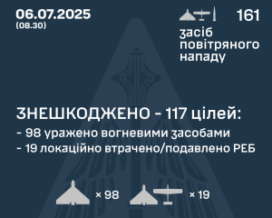 Станом на 08:30 протиповітряна оборона України знешкодила 117 ворожих БПЛА - 98 безпілотників було збито за допомогою вогневих засобів ураження, ще 19 - втрачено або подавлено за допомогою радіоелектронної боротьби. Атаки були зафіксовані на півночі, сході, півдні та в центрі країни.