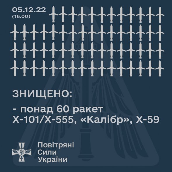 Росіяни випустили понад 70 ракет. Українські захисники збили понад 60 ракет. Про це повідомили Повітряні сили ЗСУ.