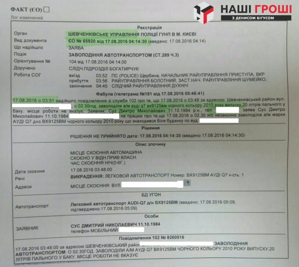 У ніч на 17 серпня прокурор Дмитро Сус написав заяву про викрадення автомобіля Audi Q7.
