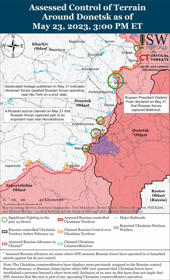 Водночас російський "воєнкор" стверджував, що українські сили просунулися поблизу Ягідного (1 км на північний захід від Бахмута) і що російські сили безуспішно атакували поблизу Григорівки (8 км на північний захід від Бахмута) та Іванівського (безпосередньо на захід від Бахмута).