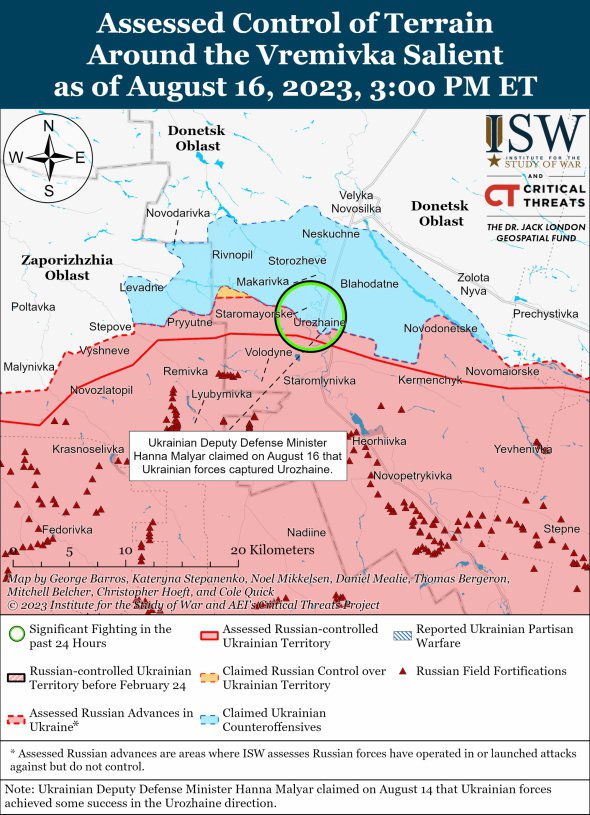 Українські війська 16 серпня звільнили село Урожайне Донецької області та продовжили контрнаступальні дії вздовж адміністративного кордону між Запорізькою та Донецькою областями.