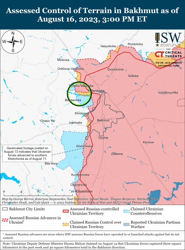 Війська РФ 16 серпня вели наступальні операції на лінії Куп'янськ-Сватове, однак не зробили жодного підтвердженого просування. У Росії заявляють про наступ в районі Синьківки з півночі. Однак ISW не знайшов візуального підтвердження цих повідомлень.