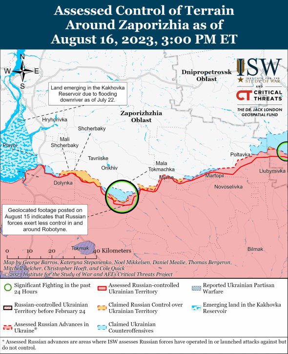 Сили оборони України просунулися на північний схід від Роботиного, що за 10 км на південь від Оріхова. Ймовірно, ЗСУ також досягли успіхів у прилеглих районах. Про це свідчать нові карти бойових дій, опубліковані Інститутом вивчення війни (ISW).