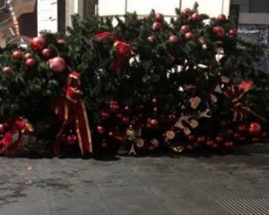 На відео видно, як чоловік лізе спочатку наверх, чіпляючись за гілки та гірлянди, а під час руху донизу він зірвався, однак гілки святкового дерева не дали йому далеко впасти.