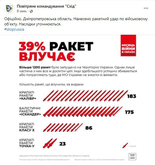 Росія завдала два ракетних удари близько 22:38 по одній з військових частин на околиці міста Дніпро.