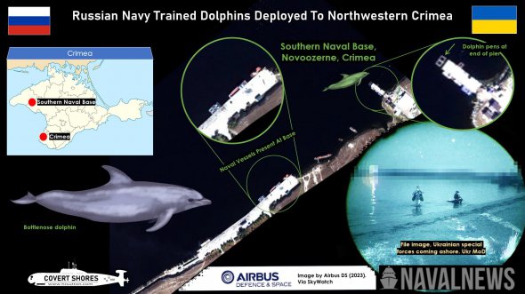 Про те, що Севастопольську бухту охороняють бойові дресировані дельфіни, ще у квітні 2022 року повідомили американські газети та Naval News із посиланням на супутникові знімки, проаналізовані американською некомерційною організацією US Naval Institute (USNI).