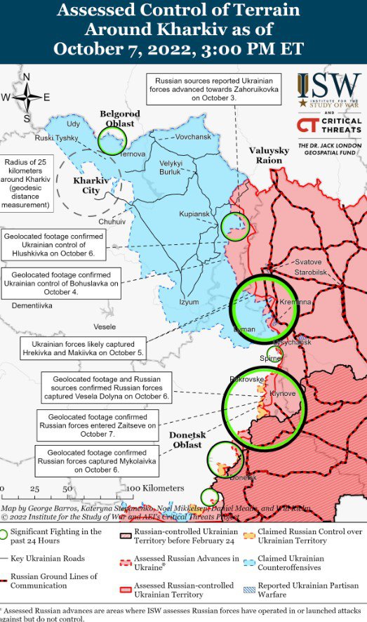 Дослідники ISW додали, що 7 жовтня російські загарбники продовжували безуспішно штурмувати позиції ЗСУ на північ від Харкова.