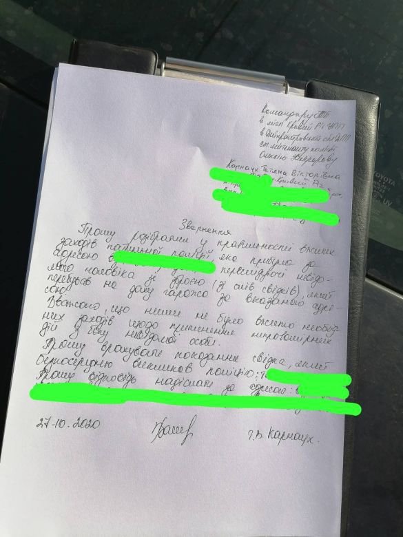 "Цей відморозок, сидячи на ялині, встиг покопатися у своєму рюкзаку, упустити додолу особисті речі: три новеньких прапорця, футболку, нижню білизну ...Поліція не оглянула дах гаража, особисті речі злочинця, прилеглі двори, як і не допитала очевидців, а люди понад годину перебували на місці. Сказали, що заяви немає від постраждалої, а значить нічого не робитимуть, і це не речові докази, а просто сміття, з яким ми можемо робити, що хочемо. Мабуть, наявності ножа в особи і загрози життю людей було мало", - розповідає Тетяна.