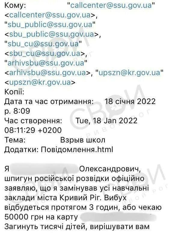 18 січня о 8:00 на електронну пошту СБУ надійшов лист про мінування навчальних закладів міста. Автор листа зажадав викуп 50 тис. грн. Повідомлення "російського шпигуна" щодо мінування перевіряють правоохоронці.