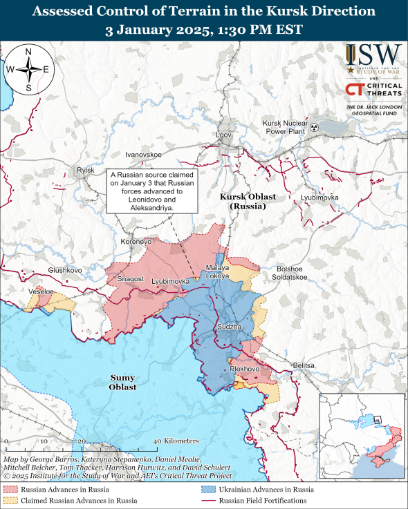 Сили оборони України та війська РФ продовжували бойові дії на головному "українському плацдармі" в Курській області 3 січня, але підтверджених змін на лінії фронту не було.