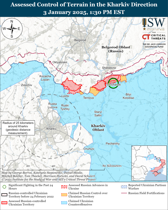 Російські загарбники на півночі Харківської області продовжували наступальні операції поблизу Вовчанська 2 і 3 січня, але не просунулися.