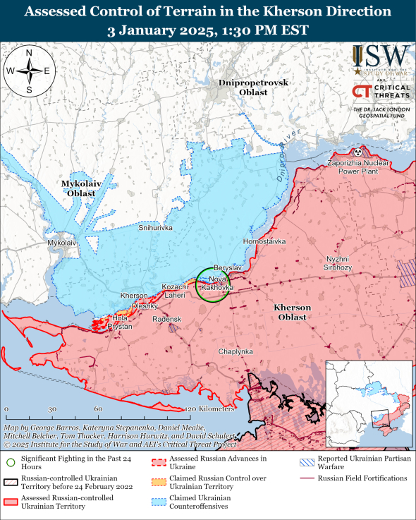 2 та 3 січня війська РФ продовжували наступати на Дніпровському напрямку, в тому числі в районі острова Козацький (на схід від Херсона).