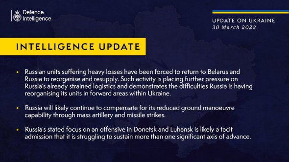 Збройні сили України контратакують ворога на північний захід від Києва. Ці атаки мали певний успіх. Українці контратакують в районі Ірпеня, Бучі й Гостомеля. Також росіяни продовжують наступ на Маріуполь. Місто безперервно обстрілюють, але центральна його частина перебуває під контролем України.