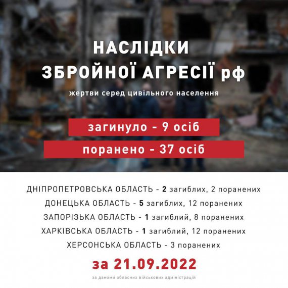 За добу, 21 вересня, Росія вбила в Україні дев'ятьох мирних жителів.