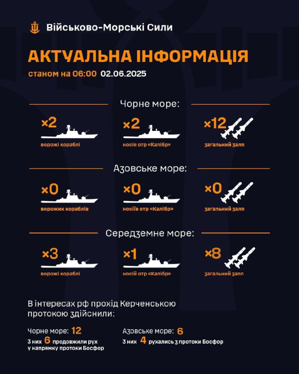 "Вони є є носіями крилатих ракет "Калібр". Їхній загальний залп сягає 12 ракет. До Середземного моря окупанти вивели три судна. Один - ракетоносій. Загальний залп становить до восьми ракет", - ідеться в повідомленні.