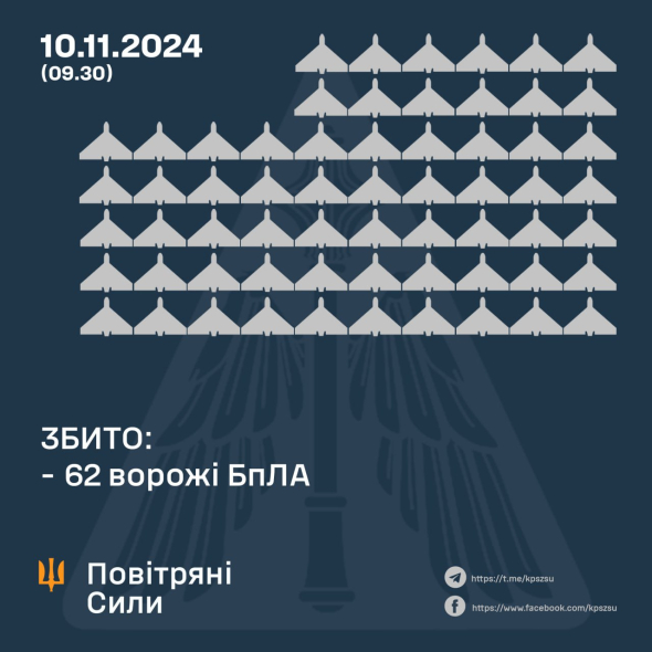 "Станом на 09.30 підтверджено збиття 62-х БпЛА противника у Одеській, Київській, Житомирській, Харківській, Полтавській, Сумській, Вінницькій, Хмельницькій, Чернігівській, Дніпропетровській, Миколаївській, Запорізькій та Донецькій областях. 67 ворожих безпілотників локаційно втрачено у різних регіонах України, ще 10 російських БпЛА вийшли з повітряного простору України у напрямку Молдови, Білорусі та РФ", - йдеться у повідомленні.