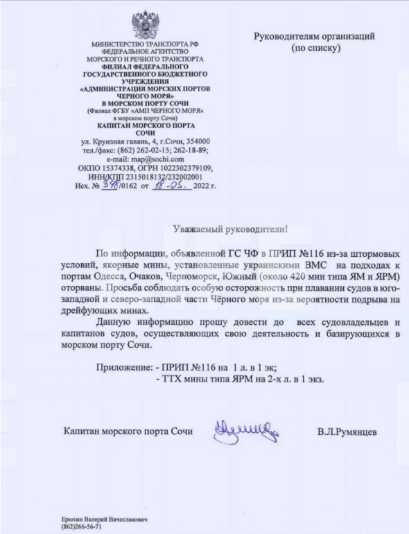 "18 березня морський порт Сочі направив судновласникам і капітанам суден у регіоні попередження про загрозу "підриву на мінах українських ВМС, які дрейфують у Чорному морі". Його підписав капітан порту В'ячеслав Румянцев", – написав він.