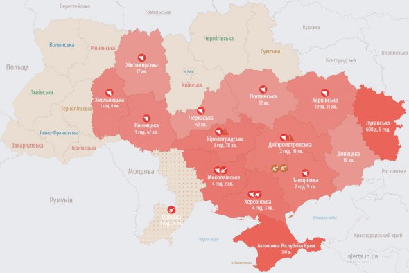 Повітряна тривога станом на 3 грудня 23:46 лунає у дев'яти областях - Київській, Вінницькій, Хмельницькій, Кіровоградській, Миколаївській, Дніпропетровській, Херсонській, Запорізькій, Харківській.