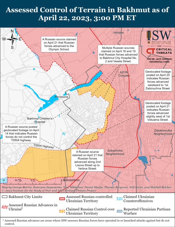 Росіяни 22 квітня продовжували наступ навколо Бахмута. Геолокаційні кадри, опубліковані 21 квітня, показують, що російські війська просунулися до траси O0506 на північний захід від Хромового. За даними російських джерел, бойовики "Вагнера" ведуть штурм дороги в цьому районі. Але росіяни визнають, що станом на 22 квітня не оточили Бахмут. Водночас російські джерела в соціальних мережах стверджують, що українські війська деякий час не користуються трасою, оскільки війська РФ перекрили дорогу. Також вони писали, що українські сили покладаються на дороги, які проходять через Іванівське, і на численні польові дороги в цьому районі.