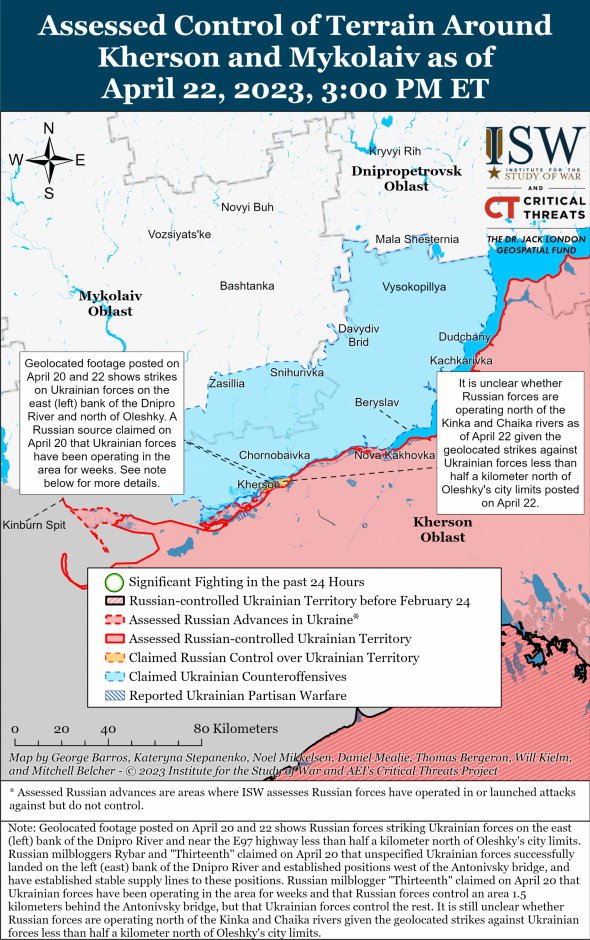 Російські війська продовжували регулярний вогонь на захід від Гуляйполя та в Херсонській області. Геолокаційні кадри, опубліковані 21 квітня, показують, що російські війська незначно просувалися на південь від Мирного. А один з російських блогерів стверджував, що українські війська провели бойову розвідку поблизу Дорожнянки.