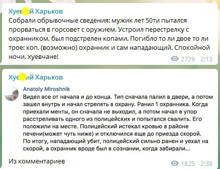 "Бачив усе від початку до кінця. Тип спочатку стріляв у двері, а потім зайшов всередину і почав стріляти в охорону. Коли приїхали правоохоронці, він не виходив, а потім почав в упор розстрілювати одного з поліцейських і намагався втекти. Поліцейський стікав кров'ю у районі печінки (може, трохи нижче)", - пише Анатолій Мірошнік.