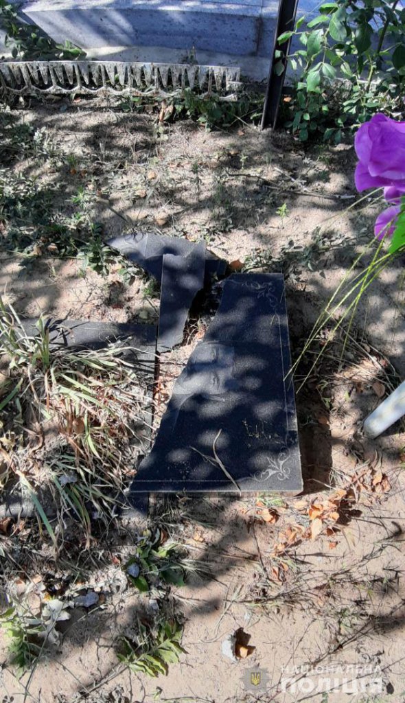 "Прийшовши провідати на цвинтар своїх померлих родичів, жінка виявила, що пам'ятник на їхній могилі пошкодили невідомі, демонтувавши його надгробну плиту та поклавши її на землю. Жінка також побачила, що на чотирьох поруч розташованих могилах такі ж самі пошкодження, а на шостій могилі – вандали надгробну плиту розбили", - з'ясували поліцейські.
