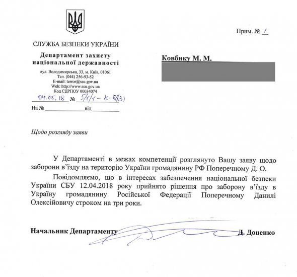 "Причиною стала антиукраїнська позиція "митця" та його заяви на підтримання російської політики в Україні, зокрема окупації Криму. Наступні три роки він не зможе потрапити на територію нашої держави", - йдеться у дописі "Відсічі".