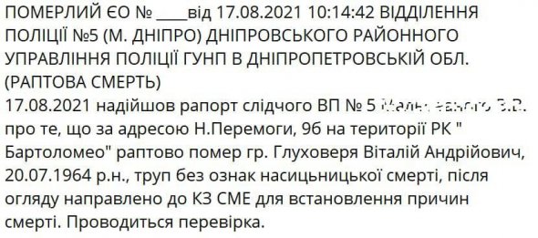 17 серпня помер колишній начальник управління поліції в Дніпропетровській області та проректор Дніпропетровського державного університету внутрішніх справ 57-річний Віталій Глуховеря. Про смерть сповістили на офіційному сайті ДДУВС.