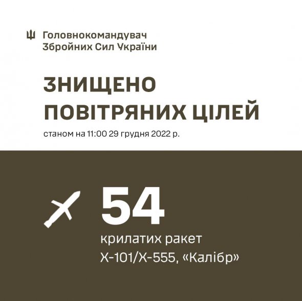 Російські загарбники вранці 29 грудня випустили по Україні крилаті ракети повітряного та морського базування, а також зенітні керовані ракети до ЗРК С-300.