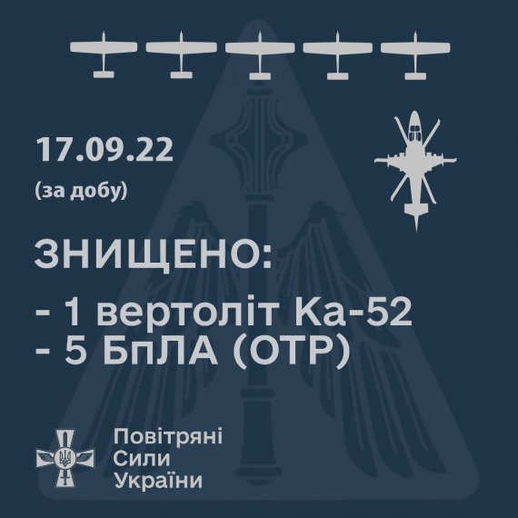 У п'ятницю, 16 вересня, Повітряні сили ЗСУ знищили російські штурмовик Су-25, три крилаті ракети "Іскандер-К" і безпілотник. Російський літак збили на Херсонщині.