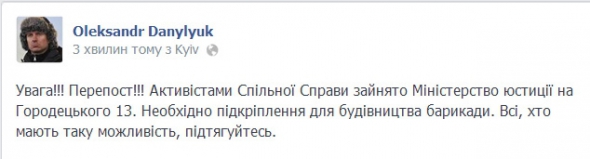 Про це на своїй сторінці у Facebook повідомив лідер "Спільної справи" Олександр Данилюк, попросивши допомогу для зведення барикад.