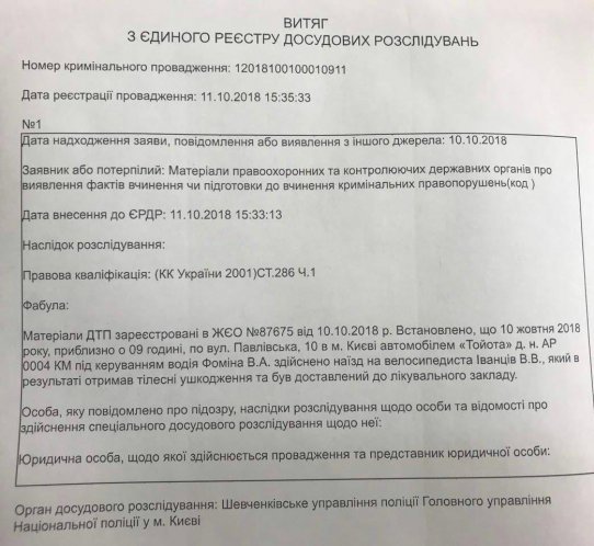 "Вранці 10 жовтня на вулиці Павлівській автомобіль Toyota, яким керував Віктор Фомін, скоїв наїзд на пішохода. У результаті отриманих тілесних ушкоджень велосипедист був доставлений до лікарні", - ідеться в документі.