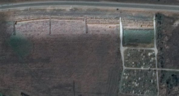 В окупованому російськими військами селищі Мангуш, розташованому менш як за 20 км від Маріуполя, супутник зафіксував братську могилу.