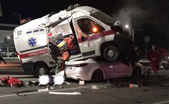 Камери відеоспостереження зафіксували, після зіткнення "швидка" кілька разів перекинулася і приземлилася на дах легковика, що їхав у зустрічному напрямку. Попередньо відомо про чотирьох потерпілих, їх доставили до лікарні.