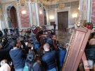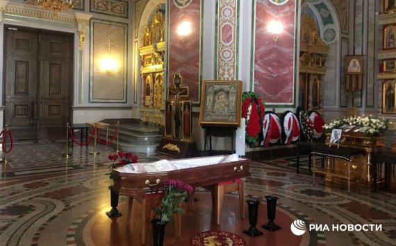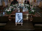 Труна з тілом Стремоусова відкрита, але обличчя його закрите вуаллю.