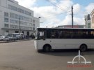 Автобус "Берестечко - Краснилівка" стоїть посеред Театрального майдану з розбитими вікнами. Всередині перебувають люди.