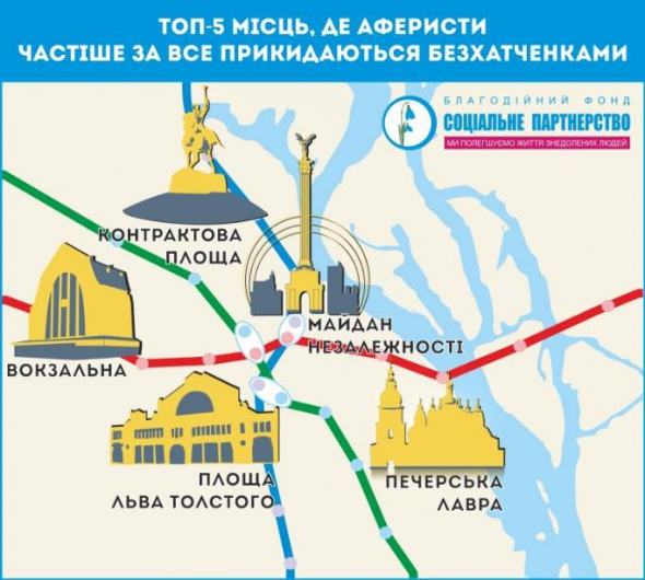 Кияни визначили 5 найпопулярніших місць серед аферистів, які наживаються на доброті людей. Це площа Льва Толстого, район метро Вокзальної, Києво-Печерська лавра, Майдан Незалежності та Бессарабський ринок. Про це Gazeta.ua розповіли у благодійному фонді "Соціальне партнество".