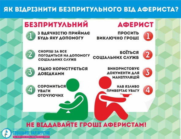 4. Аферисти, на відміну від нужденних, психологічно тиснуть на людей - голосно розповідають про своє складне життя, плачуть, демонструють каліцтва. Людина, яка дійсно потребує допомоги, ніколи не буде привертати до себе зайвої уваги.