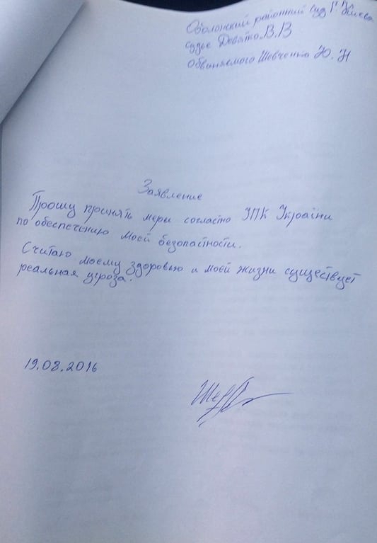 Про це в Facebook повідомила журналістка Олена Лунькова. Журналістка опублікувала фото відповідної заяви Шевченка в Оболонський райсуд Києва.
