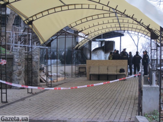 Споруда розміщена на краю оглядового майданчика поблизу Європейської площі. Слідчі ходять усередині приміщення. Біля них на покривалах, які розстелили на бетонну підлогу лежать два обгорілі трупи жінок. Всі займисті речі згоріли. Вцілили лише металеві сходи на другий поверх ресторану та бетонна конструкція. Стін немає. Раніше їх роль виконували скляні блоки. Вони потріскали під час пожежі.