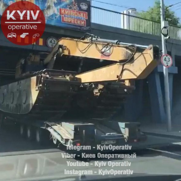 Водій транспортного засобу не розрахував висоту між проїжджою частиною мосту і дорогою внизу. Як наслідок, екскаватор ледь не зніс шляхопровід.
