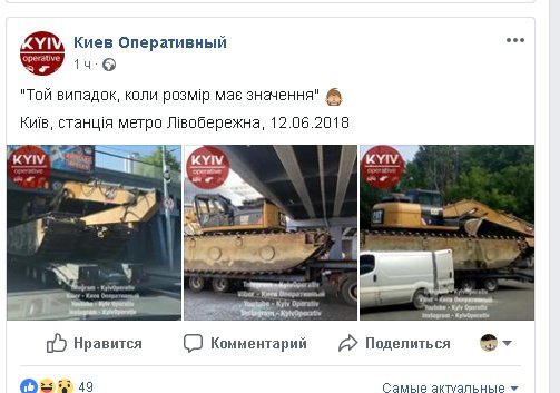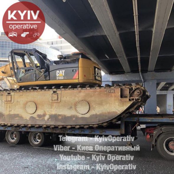 У Києві біля станції метро Лівобережна тягач із екскаватором на ходу вперлися в міст.