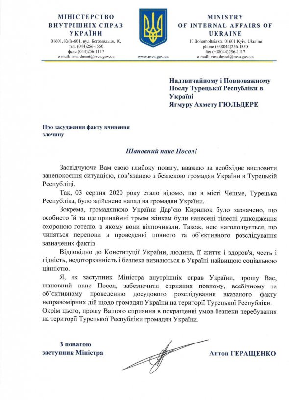 "За дорученням міністра внутрішніх справ Арсена Авакова провів зустріч із заступницею посла Туреччини в Україні - пані Букет Кабакджи й передав їй звернення щодо жорстокого побиття громадянки України Дар'ї Кирилюк, яку по-звірячому побили в турецькому місті Чешме разом з іще трьома жінками", - написав він.