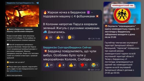 "Серед ліквідованих у Бердянську окупантів - російський воєнний злочинець, який вчиняв звірські катування місцевих громадян України. Після підриву авто гауляйтер тимчасово окупованих територій Запорізької області розпорядився збільшити комендантську годину з 21:00 до 05:00. А представники російських спецслужб негайно покинули готель та перебазувались у нове кубло", - йдеться у повідомленні.
