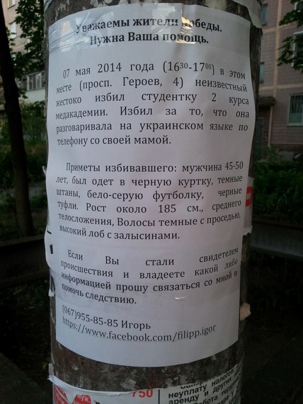 Як повідомив "Дніпропетровськ. Коментарі" знайомий потерпілої, 7 травня в Дніпропетровську на проспекті Героїв, 4 невідомий чоловік побив дівчину - студентку медакадемії, яка розмовляла по телефону українською мовою.