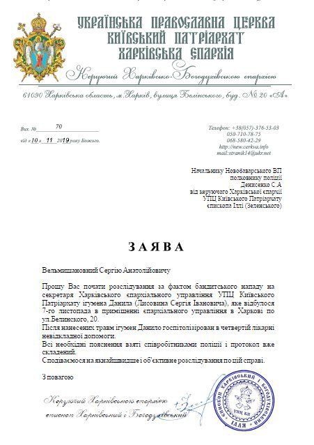 "7 листопада серед білого дня троє невідомих напали на священика коли він зайшов у Харківське єпархіальне управління, розташоване по вулиці Бєлінського, 20, і жорстоко його побили. Таким чином його хотіли залякати, оскільки нічого з речей не було прийнято й під час побиття нападники вигукували погрози на адресу Церкви й о.Данила", — розповів священик.