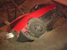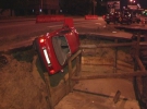 Машина провалилася у величезну дорожньо-ремонтну яму. Легковик не впав на дах, а зачепився за металеві труби ремонтних лісів.