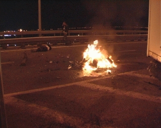 Смуги руху на мосту розділяються – праві ведуть до мосту Патона, ліва – до Видубичів. Водій вантажівки трохи заплутався і замість того, щоб поїхати ліворуч, не перелаштувався і завмер на узбіччі з правого боку. Чоловік оцінив розв'язку, вивернув кермо і сміливо рушив через суцільну, напереріз через усі три смуги. Вже за метр-два від крайньої лівої, він відчув потужний удар у зад вантажівки. Удар був такої сили, що хлопець вилетів зі свого мотоциклу, який після надпотужного удару спалахнув.